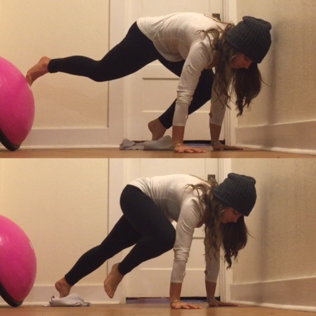 It’s a little complex and you feel pretty uncoordinated at first. But after a few rounds, you get the hang of it and find your rhythm. Start in plank (see a pattern here?!) with your feet on a blanket. Lift your left foot up and take your left knee to your left elbow. From this point until the end of this side the left foot stays in the air and the right foot stays on the blanket. Kick your left foot back (it’s still up in the air) as you drag your right knee toward your right elbow (foot is still on the blanket). And switch. And switch. I usually start my students with a MAX of 10, because don’t forget you have the other side to do too.