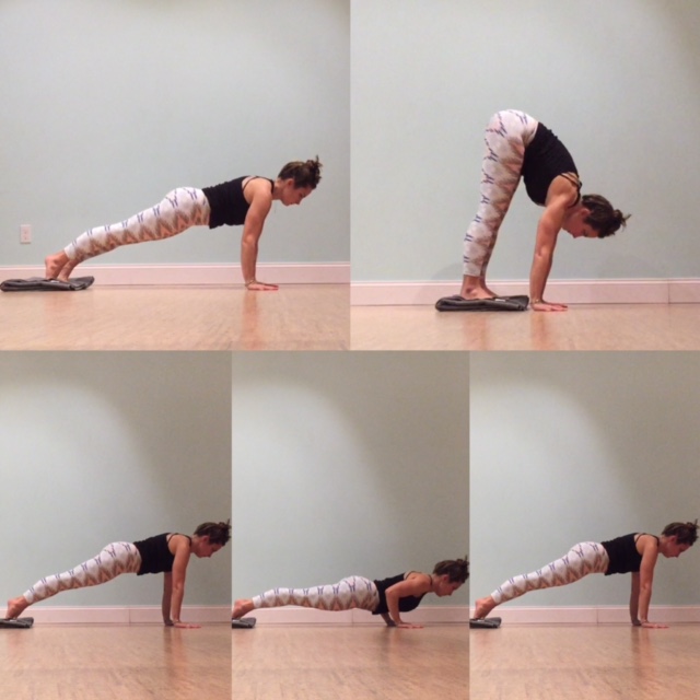 Starting in high plank with the feet on a blanket, drag the blanket toward your hands. Once they get as close to the wrists as possible, walk your hands back out in front of you to come back to high plank. Option to throw in a chaturanga push-up here. I usually have my students start on one side of the studio, traverse the room with these one time back and forth, or until they feel the burn. And then take 3 more.