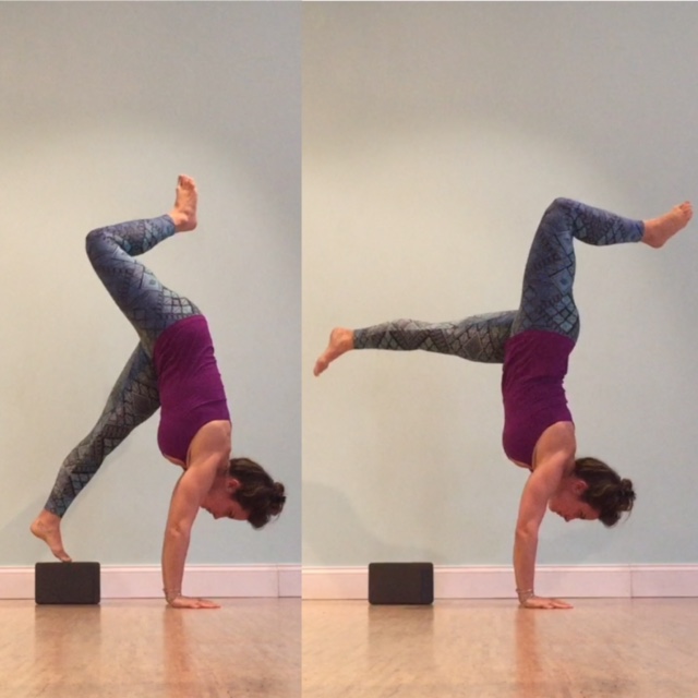 This is a new core exercise for me, and it’s a way to get that much closer to a press-up handstand! Bring one foot on a block and plant your hands flat as close to the block as possible. Your other leg is lifted up in the air, and bent out to the side in nearly a straddle. Again, no way to attempt this without engaging the low abdominal muscles. You’ll feel those babies fire up in no time. In theory, your hips are stacked directly over your shoulders, and your abs are strong and engaged enough to lift the bottom foot off the block.